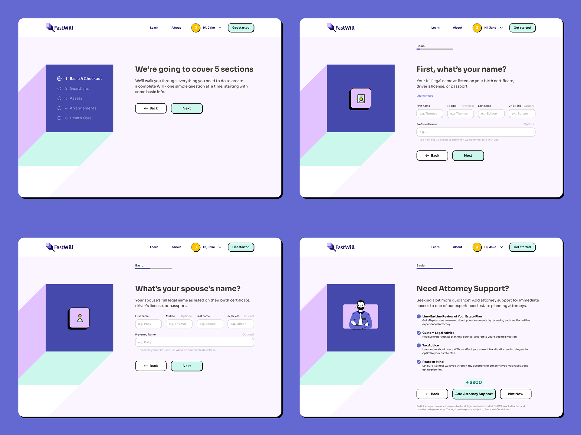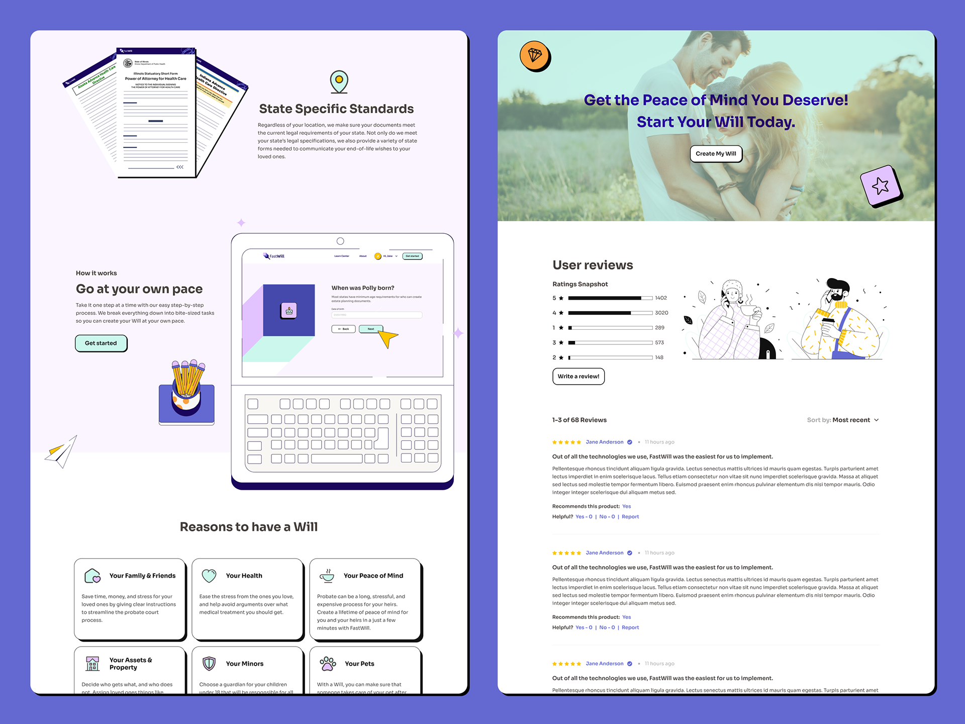 We then put together a website UI that brings the brand together through engaging content, interactivity, and animations. It was important to guide users through understanding the Will creation process and initiating it, taking them through each step in a visually captivating way.