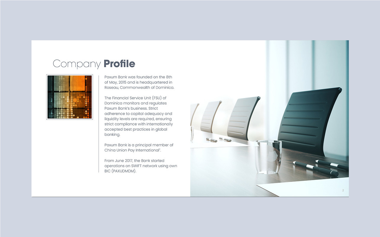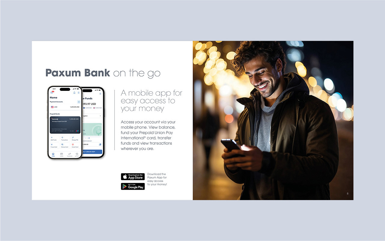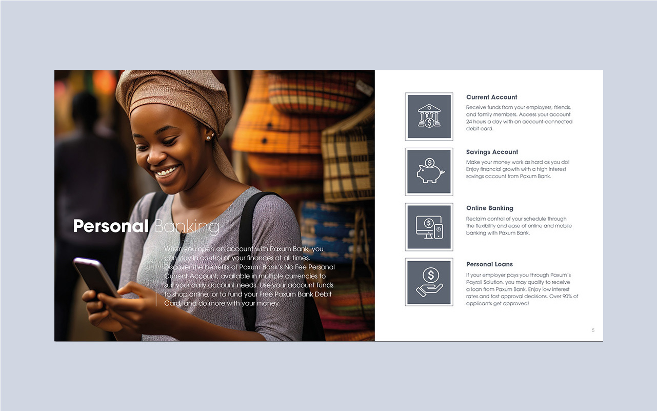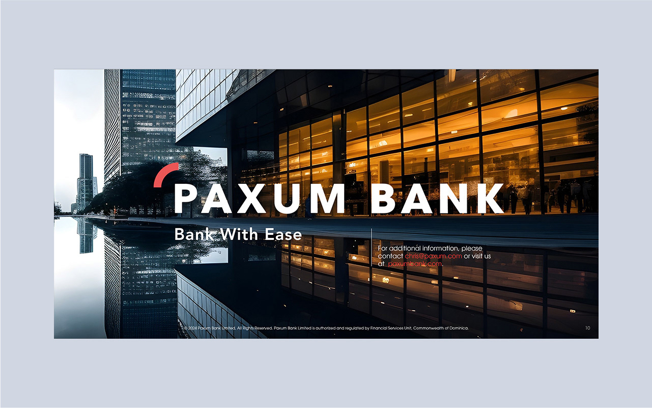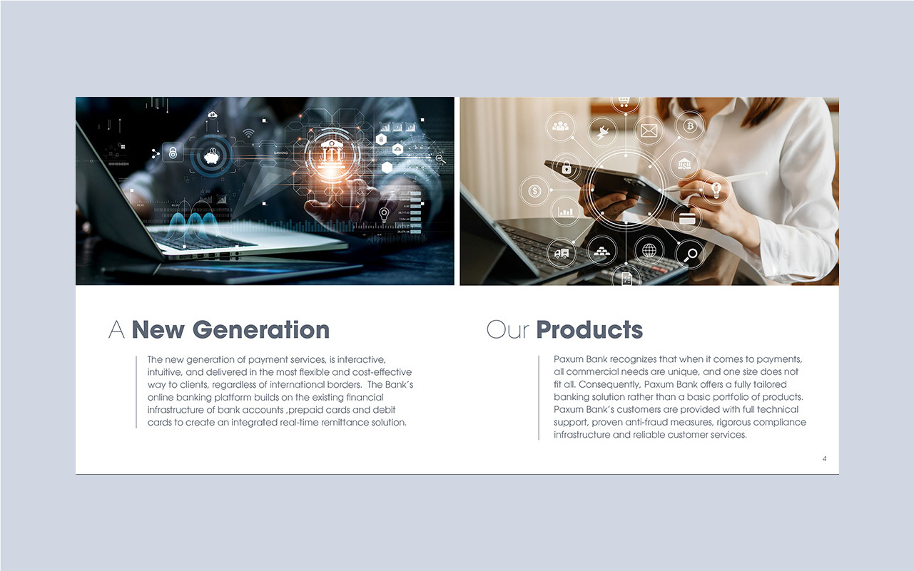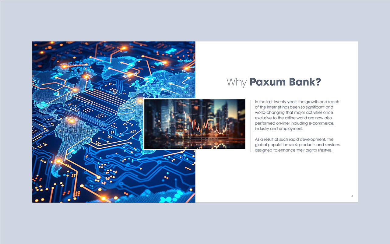 Paxum Bank required a more cohesive brand identity for its investor communications, specifically needing a brand designer to develop a new print presentation. I led the project by conducting a brand audit, designing a refreshed visual system, and meticulously applying it to a new, impactful print presentation. This resulted in significantly improved professionalism and persuasive power for Paxum Bank's investor meetings.